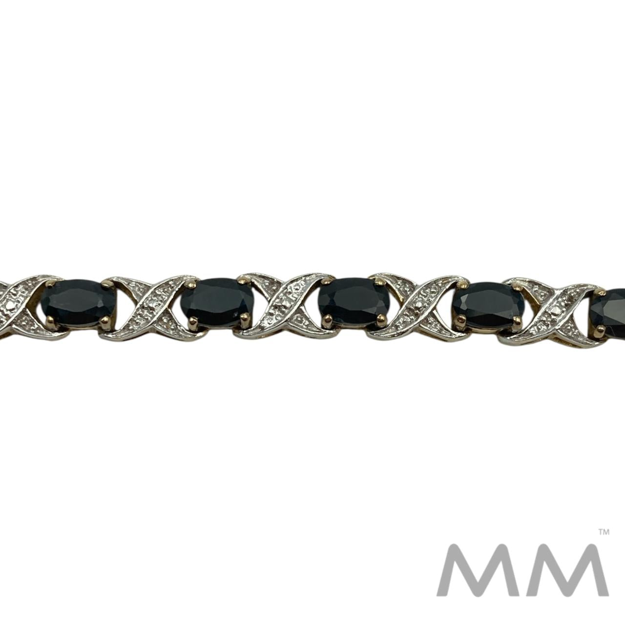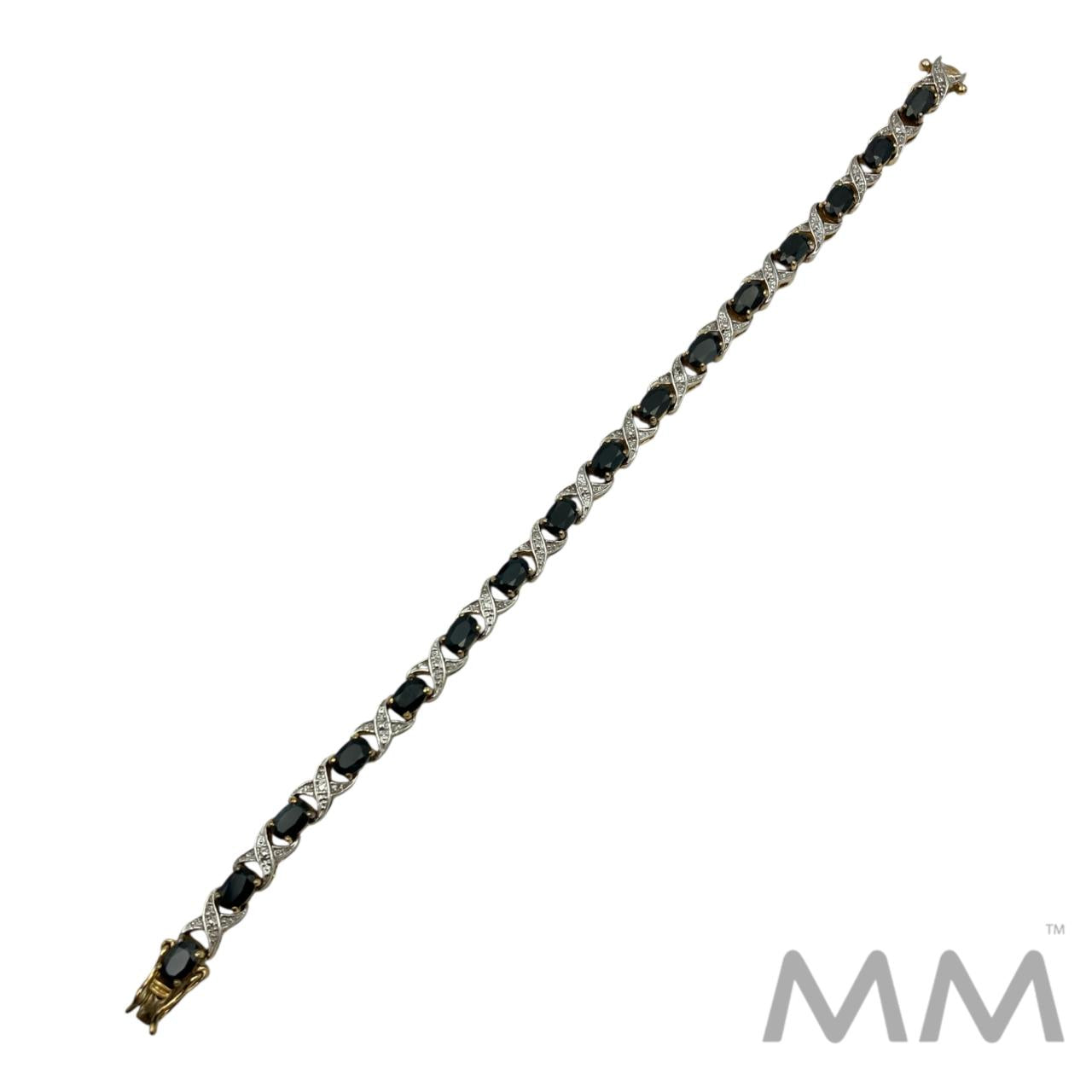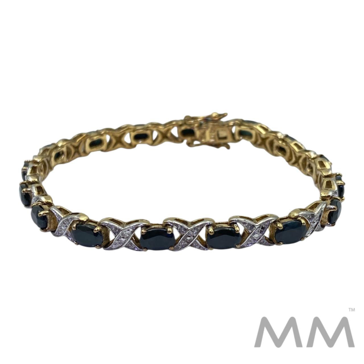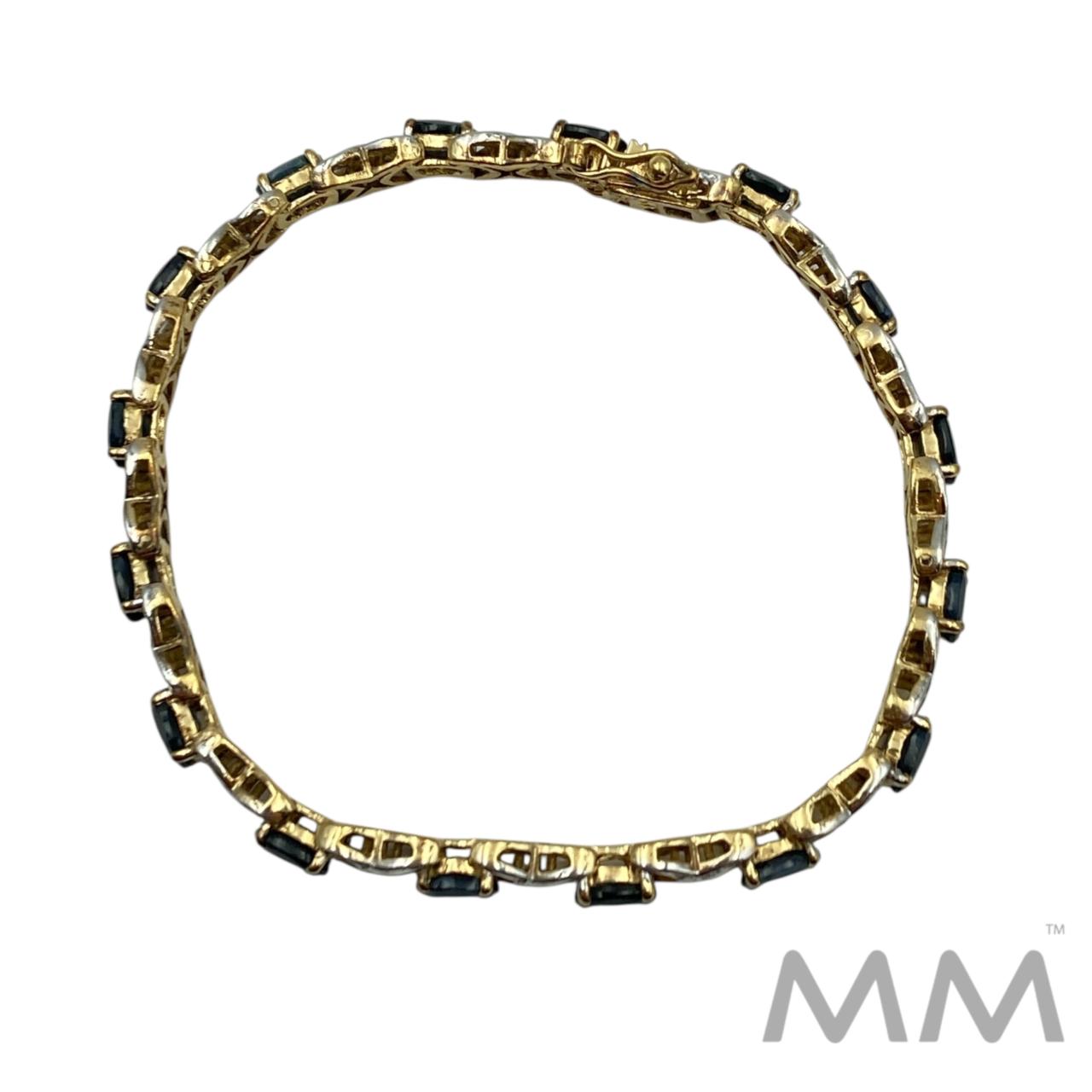 Description: This elegant bracelet features 16 oval faceted blue sapphires, totaling 13.92 carats, beautifully set in sterling silver with a rich gold-plated finish. The deep blue sapphires contrast perfectly with the warm gold tone, creating a timeless and sophisticated look. Measuring 7.25 inches in length and weighing 14.3 grams, this bracelet is a striking addition to any fine jewelry collection.