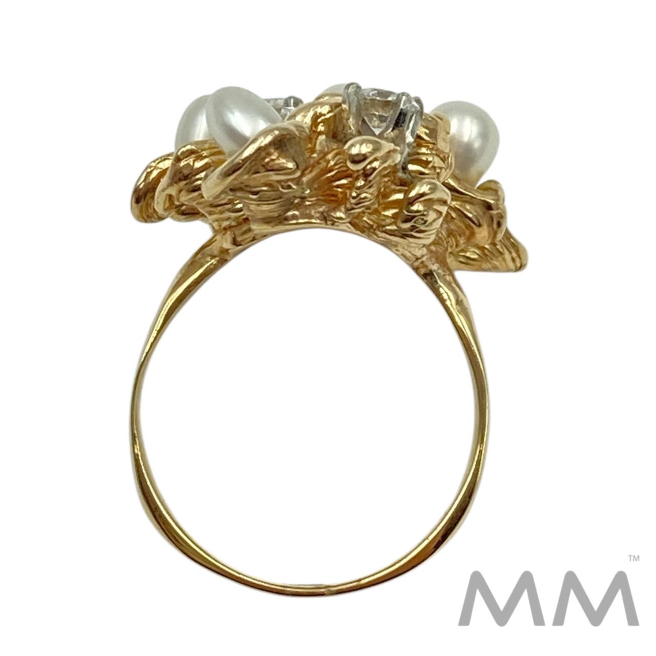 Description: This free-form ring blends 1.19ctw of sparkling round diamonds with five freshwater cultured pearls, creating a beautifully organic design in warm 14K yellow gold. With its substantial 13.2-gram weight and artistic silhouette, it offers a bold yet elegant statement.