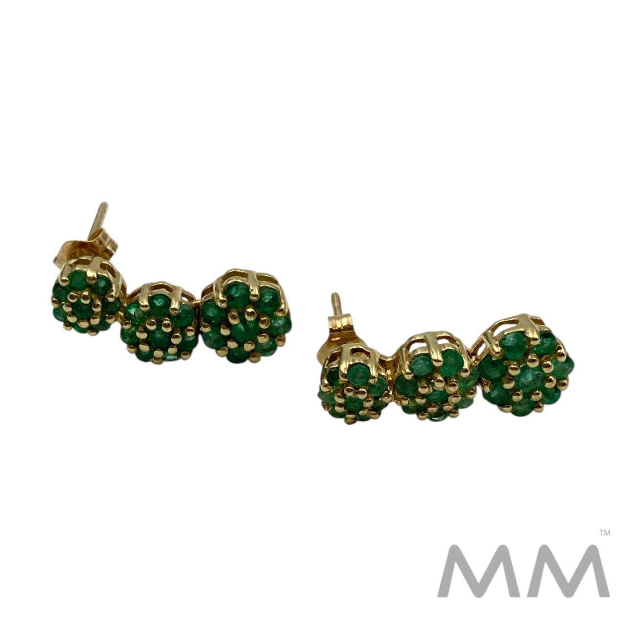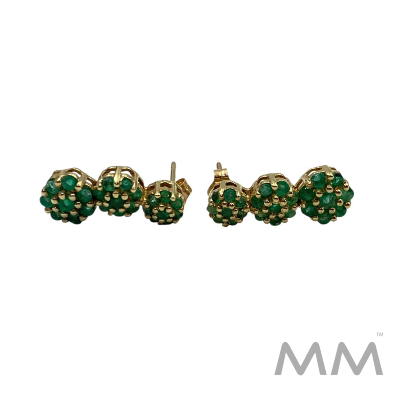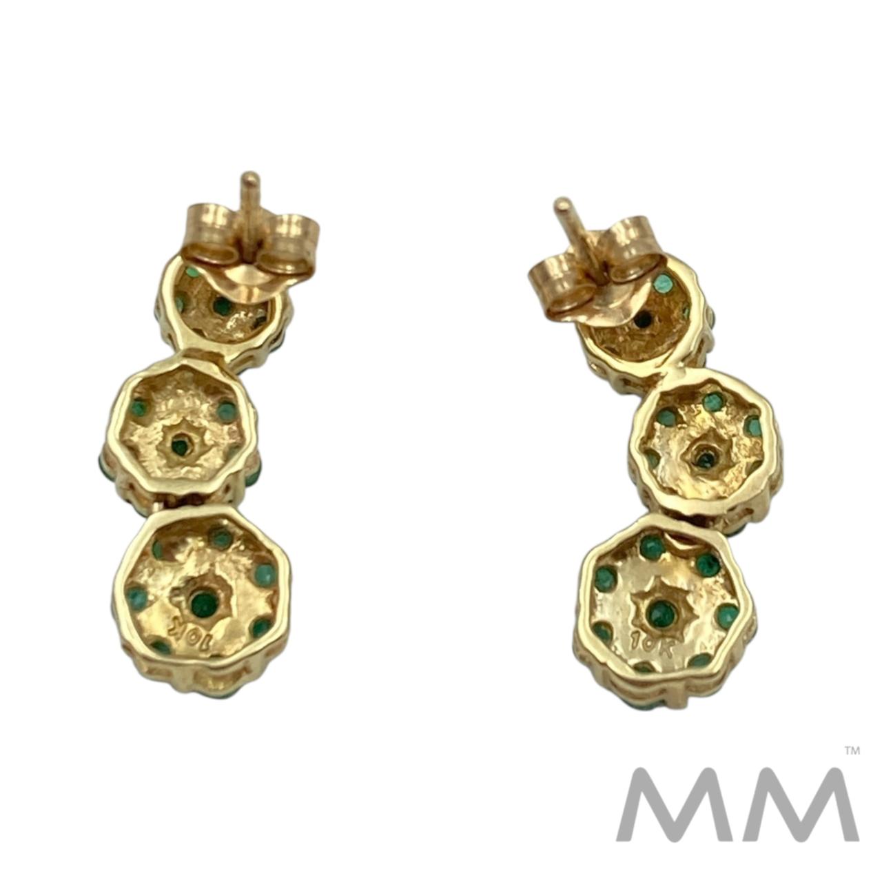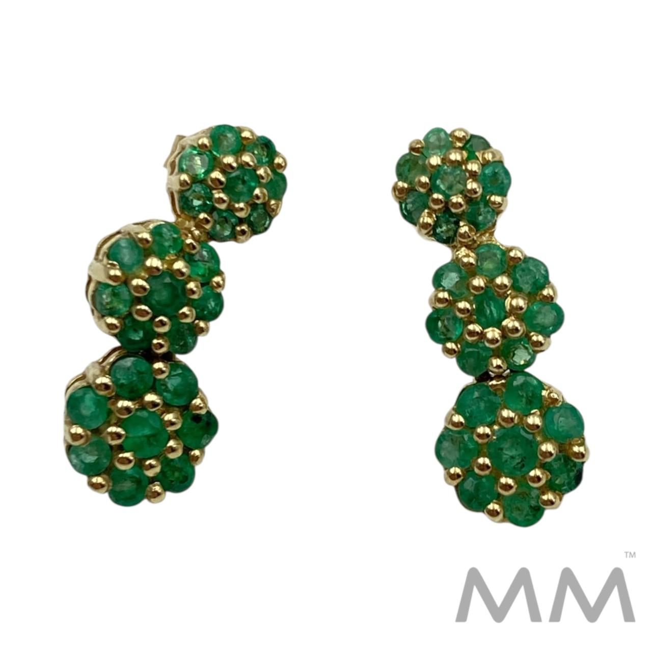 Description: These circa 1980’s fixed drop earrings are crafted in 10K yellow gold and feature three elegant segments of round emeralds. With a total of 48 natural emeralds weighing .78ctw, they showcase vibrant green beauty, each stone displaying natural inclusions characteristic of genuine emeralds. Measuring 0.75 inches in length and weighing 2.7 grams, they offer a refined, lightweight style perfect for everyday elegance or special occasions.