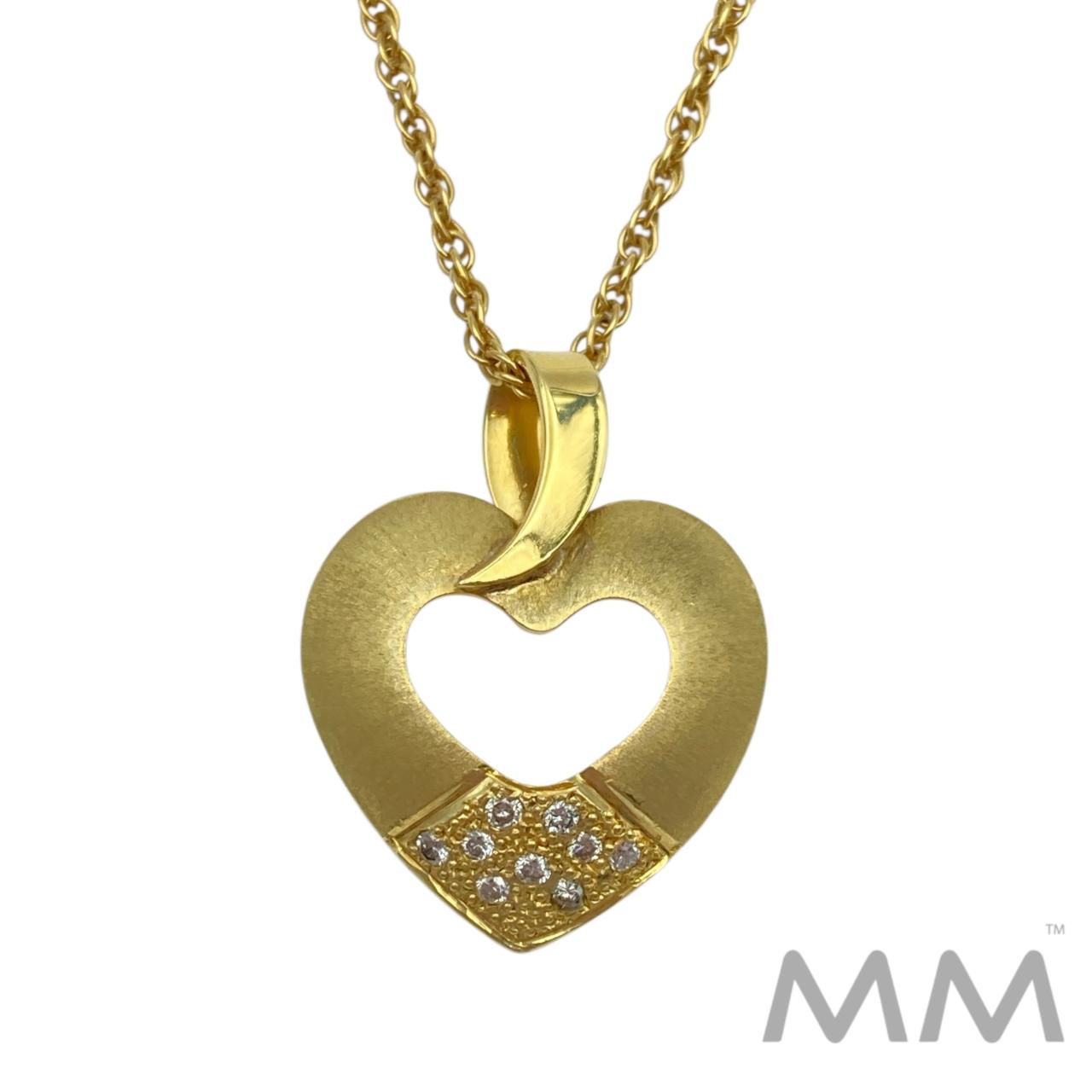 Description: This elegant necklace features a 14K yellow gold chain paired with an 18K yellow gold heart-shaped pendant adorned with nine sparkling round diamonds totaling .16ctw. The pendant showcases a mix of high-polish and brushed finishes, creating a refined contrast that enhances its romantic design. Measuring 17.50" in length and weighing 14.1 grams, this piece offers timeless beauty and exceptional craftsmanship.