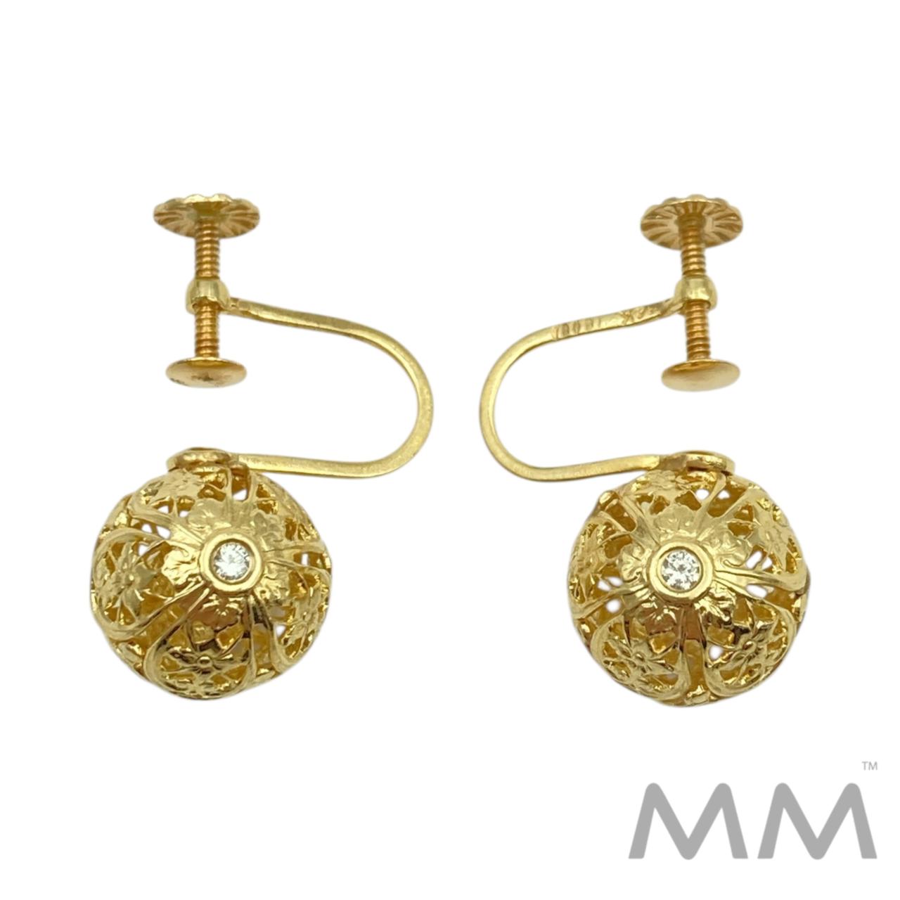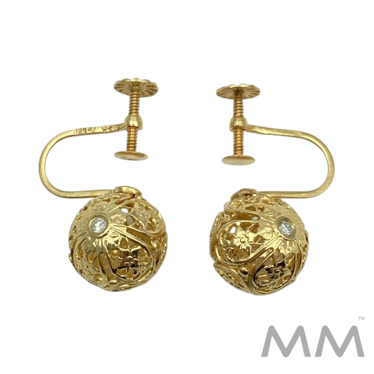 Description: These vintage 14K yellow gold earrings feature a delicate round filigree design, crafted for non-pierced ears. Each earring is accented with two bezel-set round diamonds for subtle sparkle.