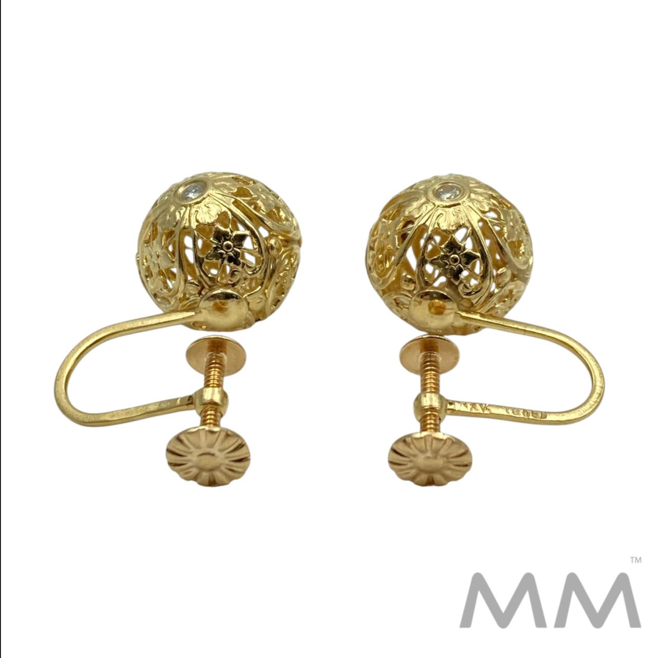 14K Yellow Gold Filigree Screw-Back Earrings with Round Bezel-Set Diamonds