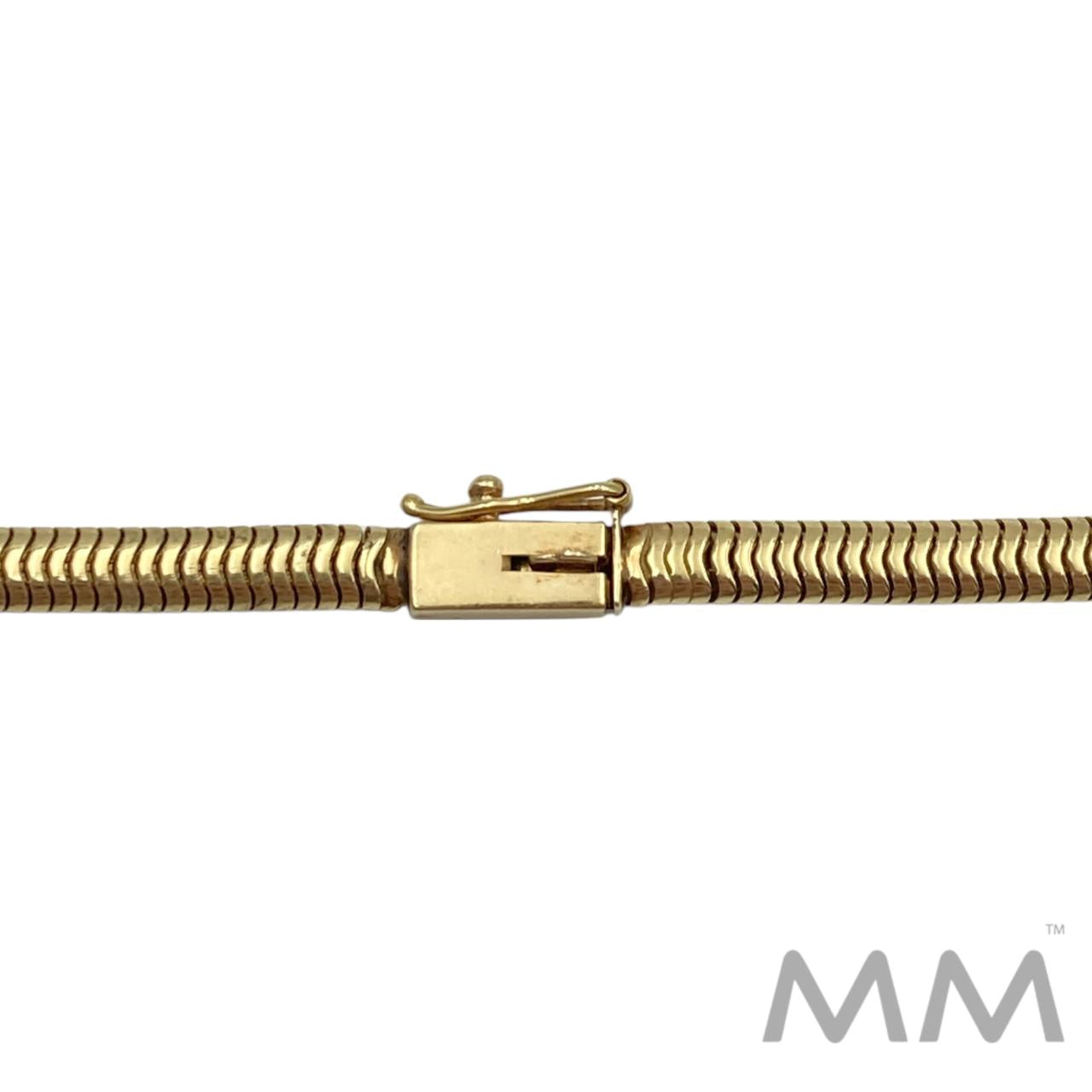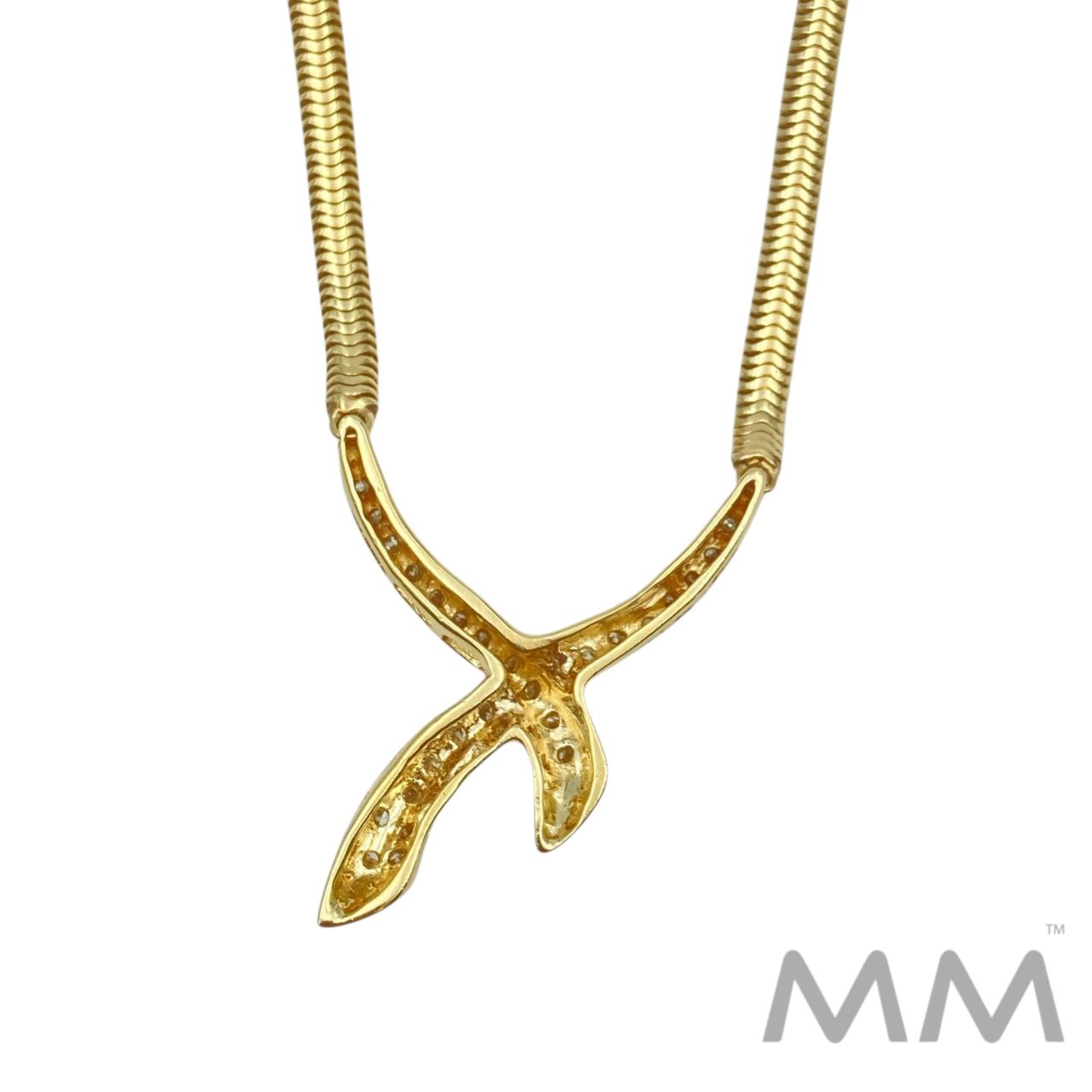 Description: This striking 14K yellow gold necklace features a freeform “X” shaped pendant gracefully attached to a sleek snake chain. Set with 26 round brilliant diamonds totaling .88ctw, each stone shines with SI1 clarity and G color for exceptional brilliance. Measuring 14" in length and weighing 21 grams, this bold and modern design makes a sophisticated statement piece.