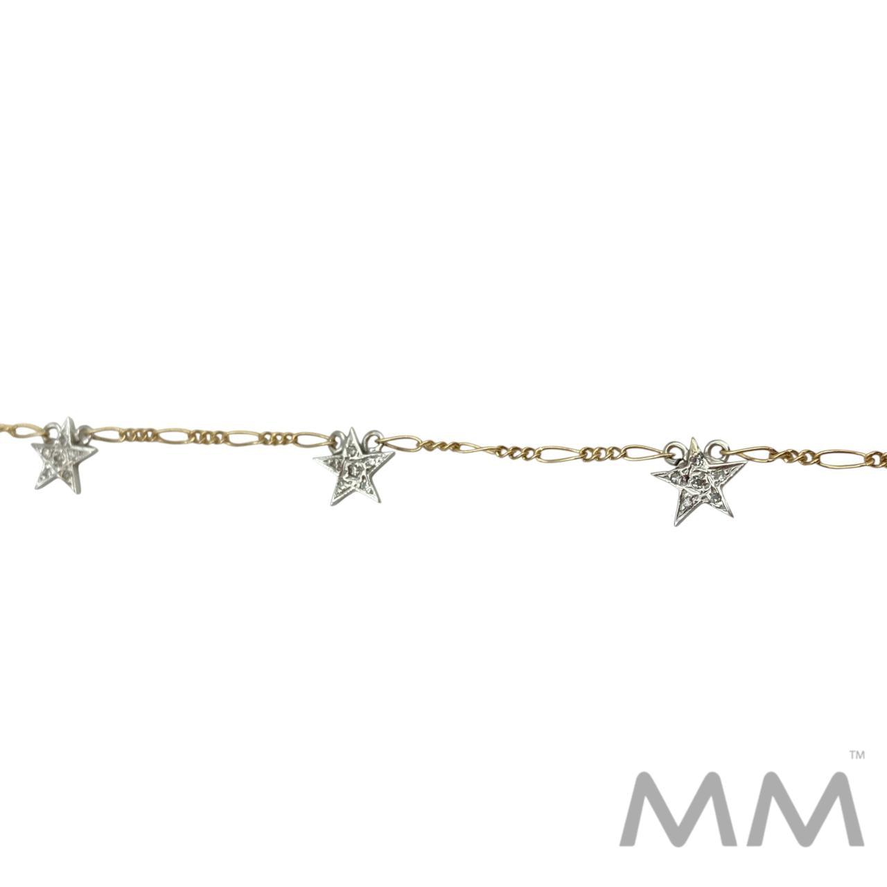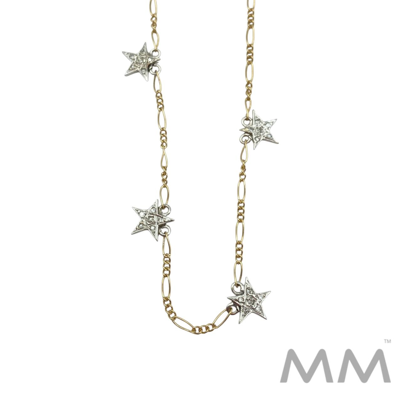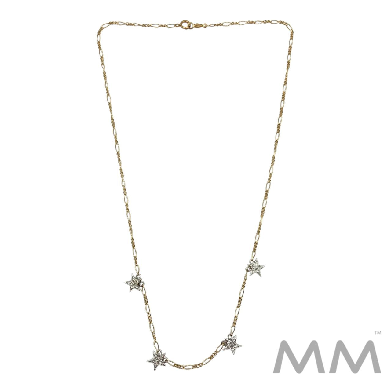 Description: Crafted in 14K yellow and white gold, this charming necklace features four dazzling star charms adorned with round pave-set diamonds totaling .10 carats. The mixed-metal design adds a modern, two-tone elegance, making it a versatile piece for any jewelry collection. Measuring 16 inches in length and weighing 3.2 grams, it offers a delicate sparkle perfect for everyday wear or layering.