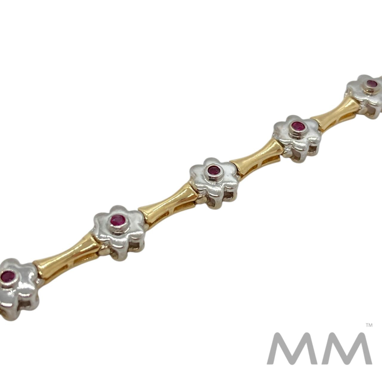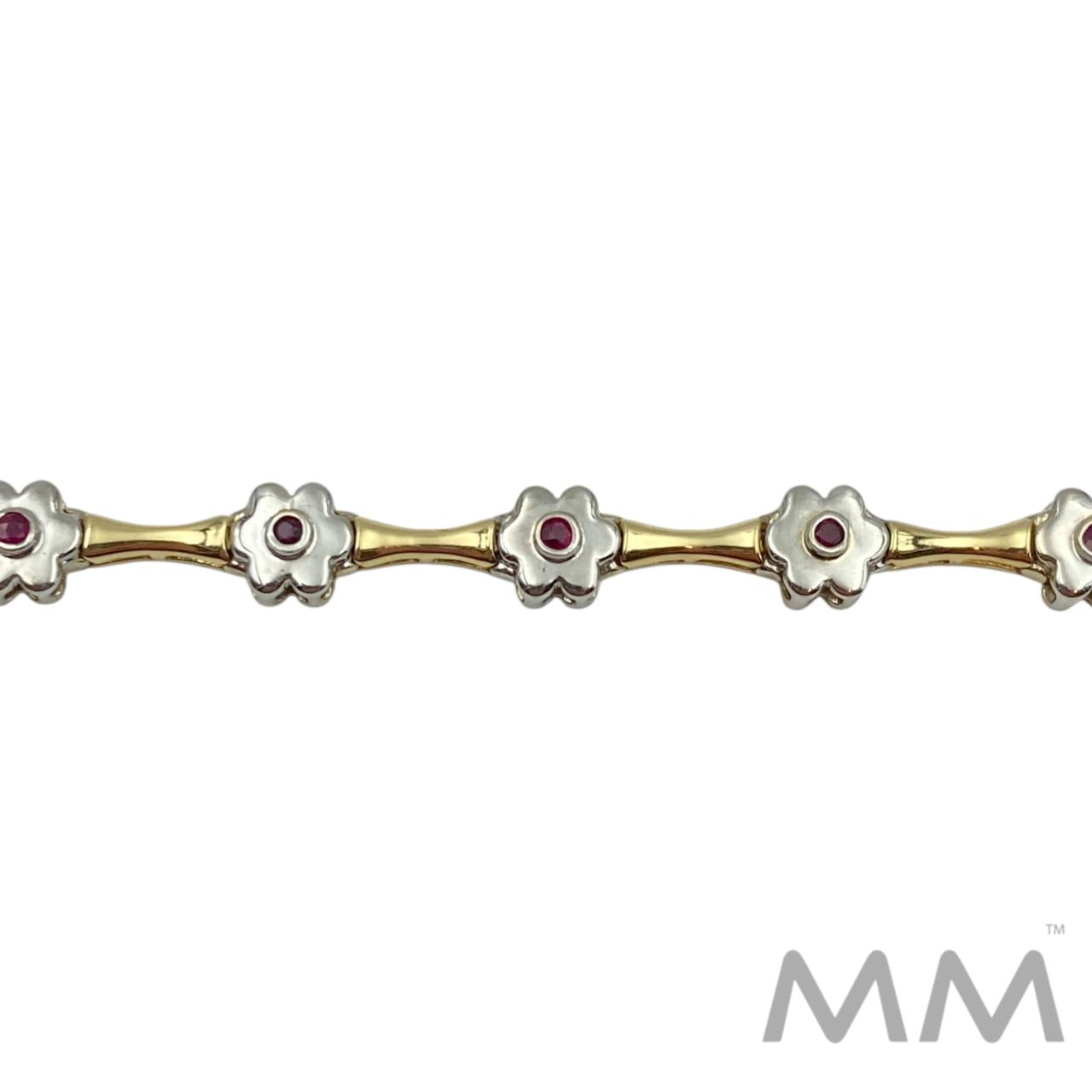 Description: This elegant 14K yellow and white gold bracelet features a charming alternating design of white gold flower motifs with bezel-set round rubies and polished yellow gold links. The twelve rubies total .21 carats, adding a subtle touch of color and sophistication. Measuring 7 inches in length and weighing 12.5 grams, it’s a beautifully balanced piece perfect for both everyday wear and special occasions.