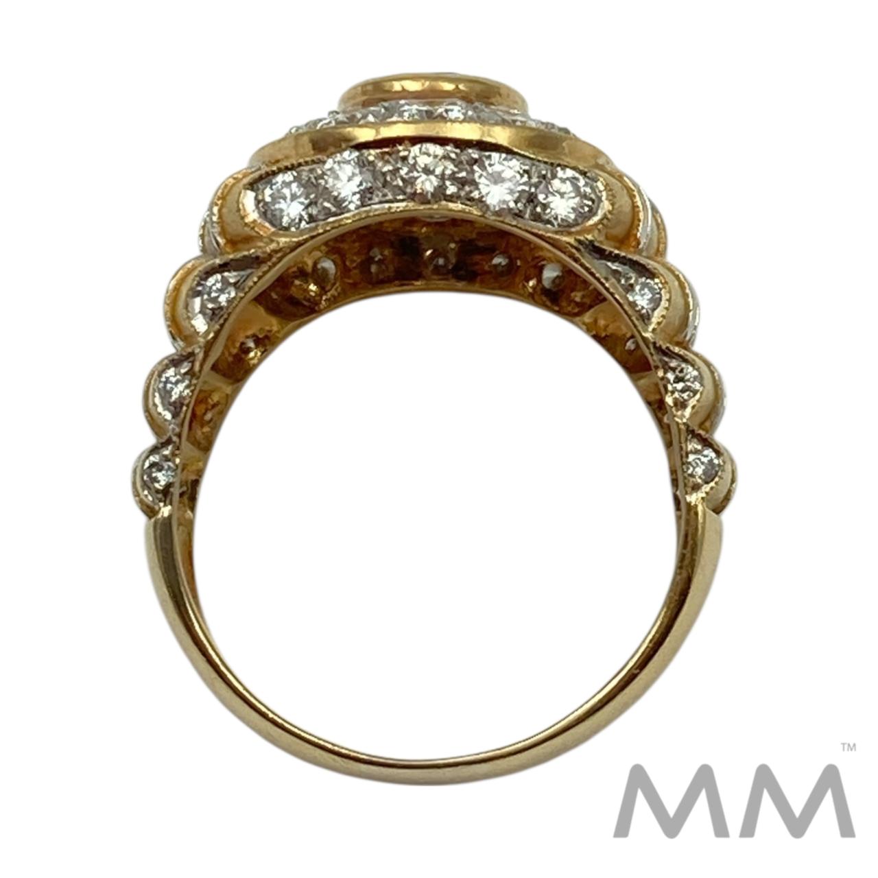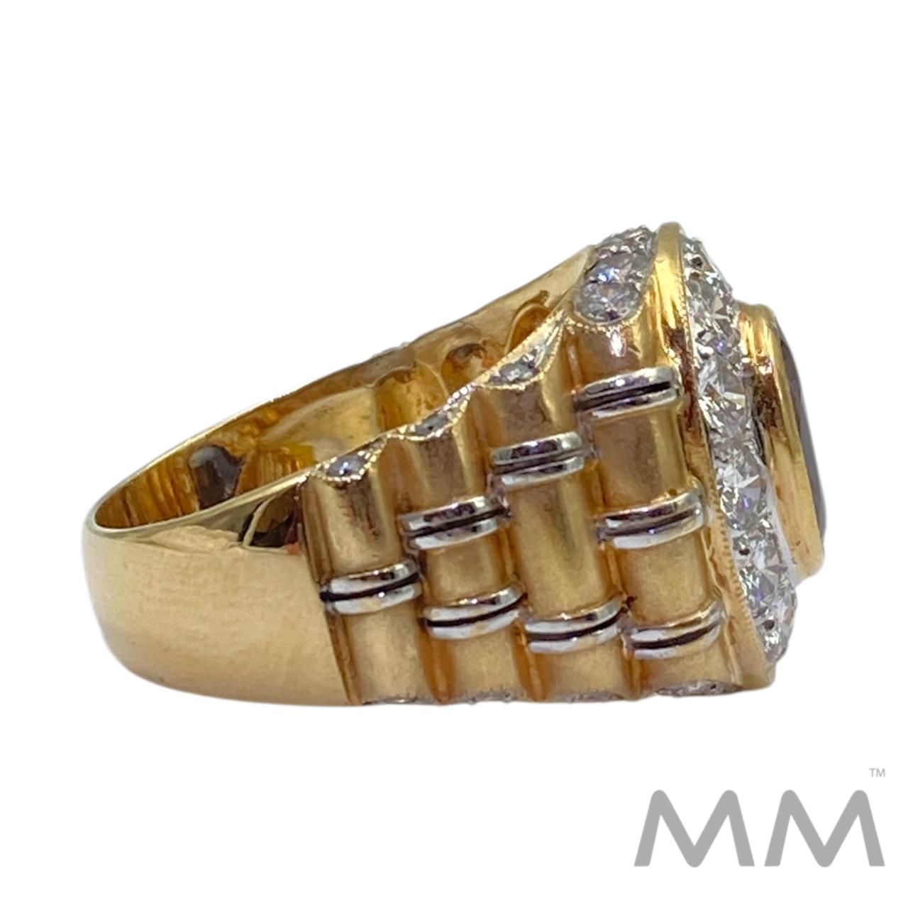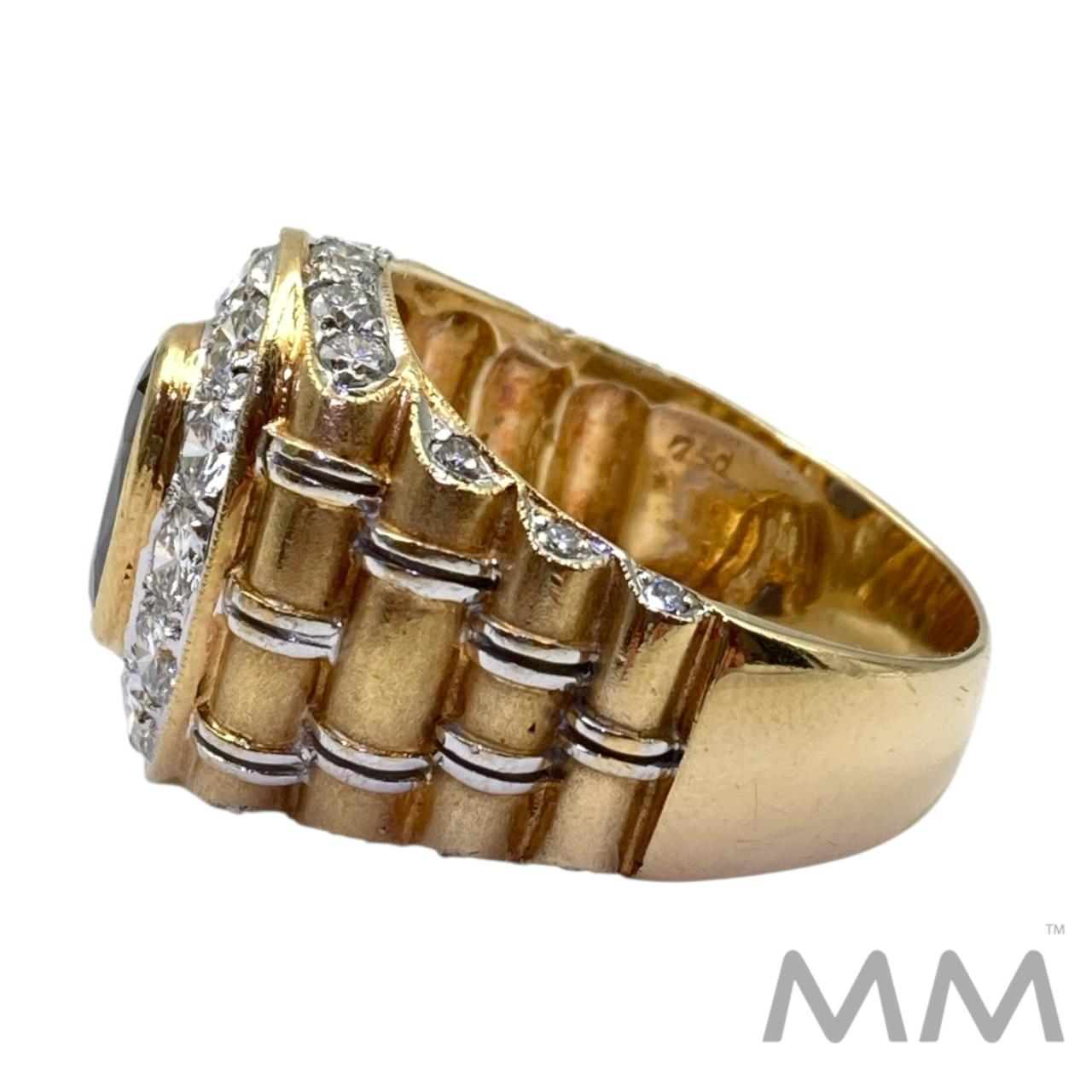 Description: This distinguished men’s ring features a striking 2.49-carat oval-cut blue sapphire set at the center, surrounded by 1.82 carats of sparkling round diamonds. Crafted in luxurious 18K yellow and white gold, the design balances bold sophistication with timeless elegance. Weighing 13.9 grams and sized at 10, this statement piece is ideal for the man who appreciates refined craftsmanship and enduring style.