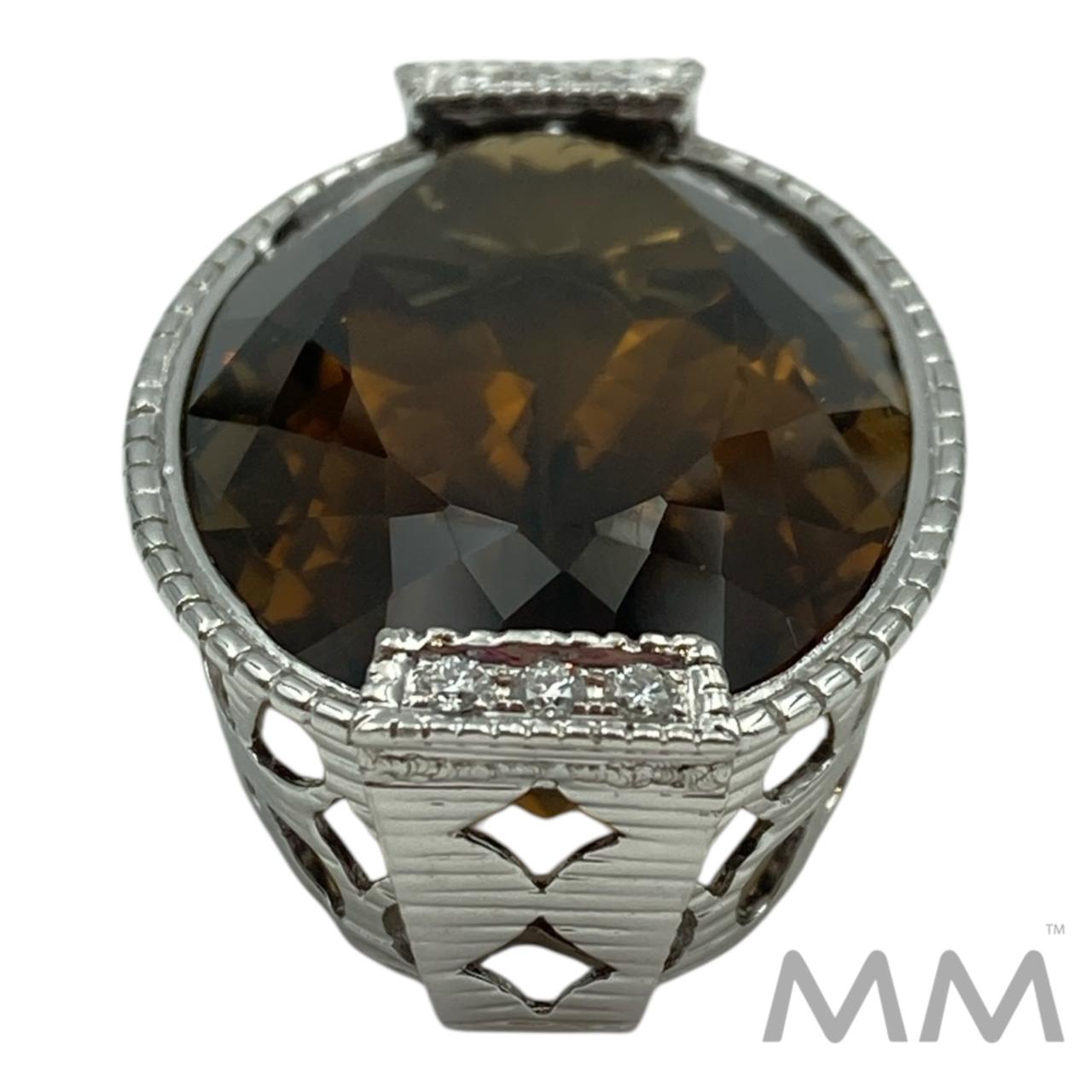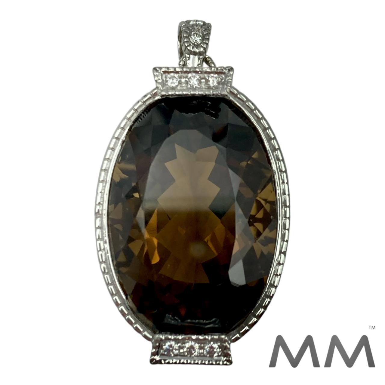Description: Crafted in elegant 18K white gold, this pendant showcases a stunning 44.79-carat oval smoky quartz, bezel set to highlight its deep, faceted brilliance. Ten round diamond accents totaling 0.23 carats add a refined sparkle, enhancing the stone’s warm, smoky hue. With beautiful fabrication and a substantial 17.8-gram weight, this pendant is a striking statement of sophistication and craftsmanship.