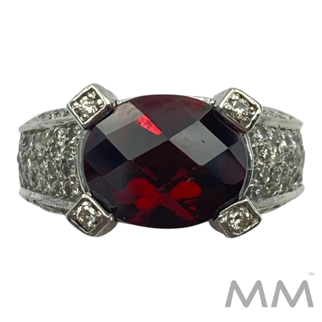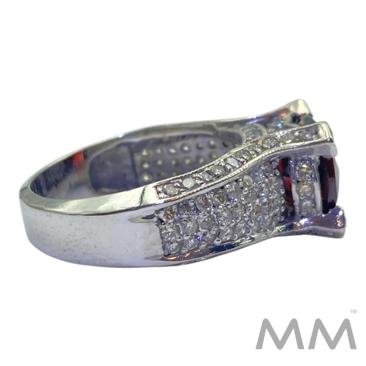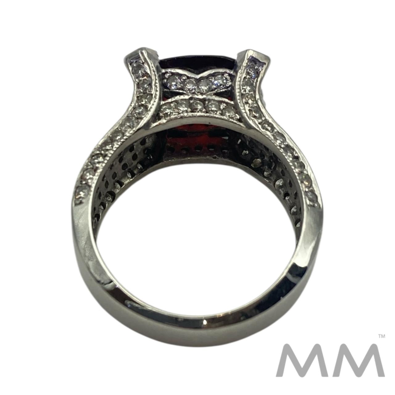 Description: Crafted in 14K white gold, this stunning ring features a vibrant 4.60ct oval-faceted garnet as its center stone, radiating vivid red brilliance. Surrounding the garnet are 1.20ctw of round pave-set diamonds along the shank and head, adding exceptional sparkle and dimension. Weighing 6.7 grams and sized at 6.25, this elegant piece beautifully balances bold color with timeless sophistication.