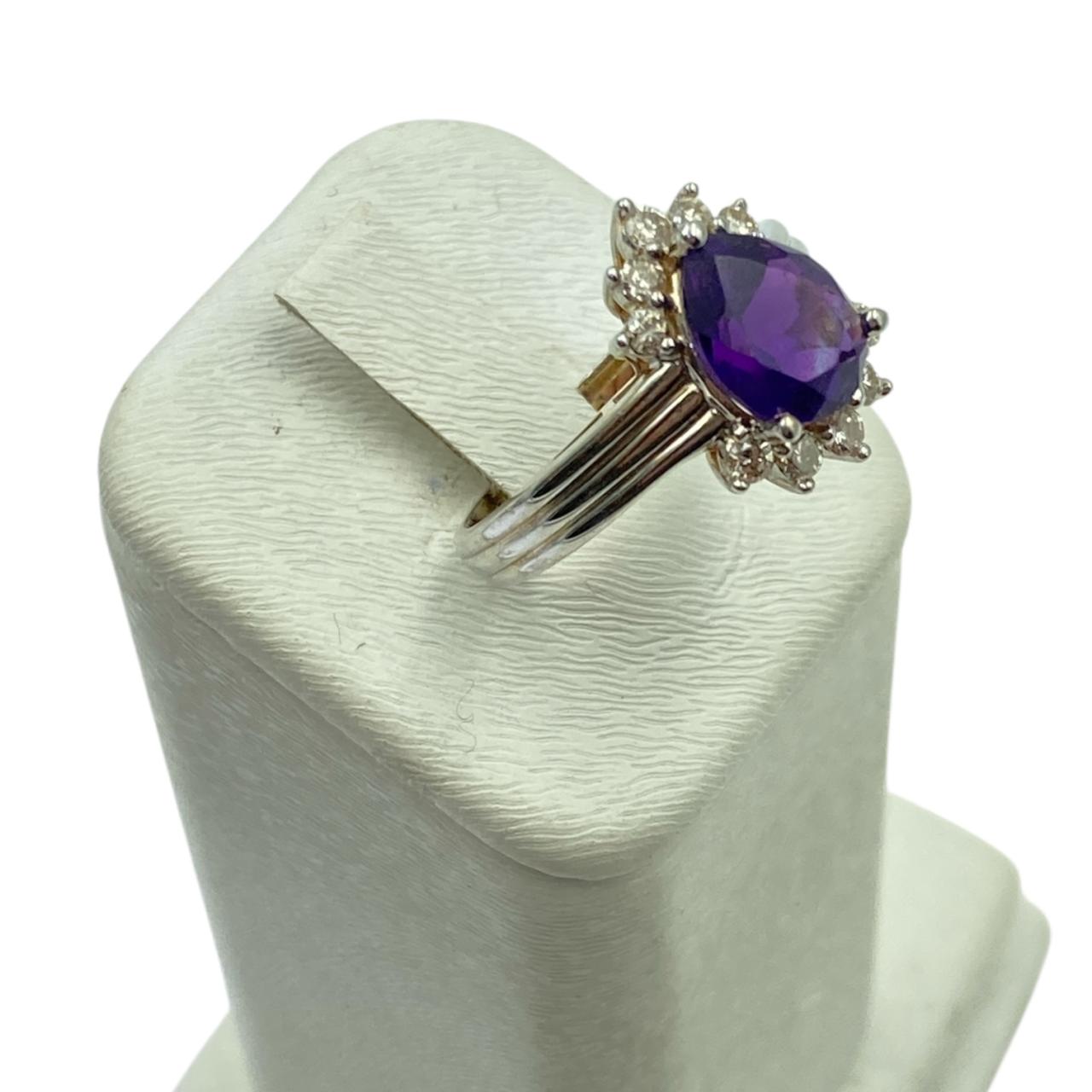 Description: Crafted in 14K white gold, this elegant ring features a 1.70ct pear-shaped faceted amethyst as its vibrant center stone. Ten round brilliant diamonds accent the amethyst in prong settings above and below for a stunning, balanced sparkle. Weighing 3.7 grams and sized at 6, this piece combines timeless sophistication with a pop of rich color.