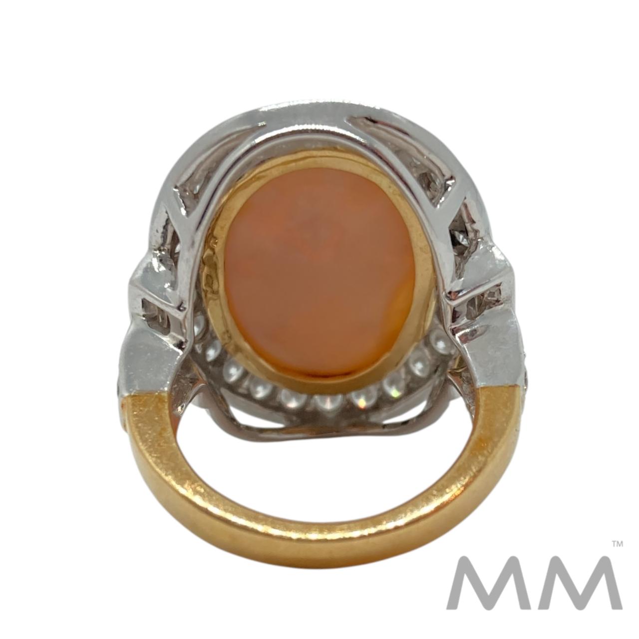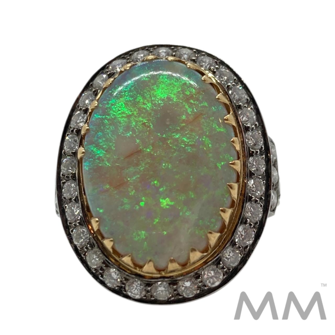 Description: This stunning 14K white and yellow gold ring showcases an impressive 8.50ct oval opal that radiates vibrant flashes of color. Surrounding the center stone is a sparkling halo of round diamonds, extending down the shank with a total diamond weight of 1.14ctw. Weighing 11.8 grams and sized at 6, this luxurious design beautifully blends bold elegance with timeless craftsmanship.