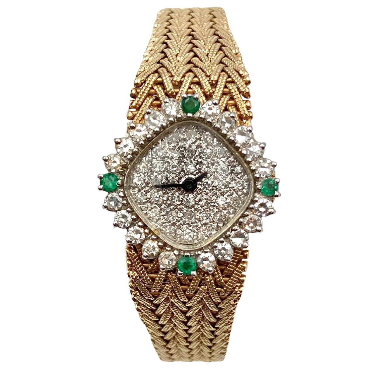 Condition: This elegant cocktail wristwatch is crafted in 14K yellow gold, featuring a 20mm rounded cushion-shaped case with a diamond and emerald bezel and a diamond-set dial. It is powered by a manual-winding Semag 17-jewel movement with a mineral glass crystal and an integrated 14K yellow gold mesh bracelet, and is set with approximately 1.08 total carats of single-cut diamonds (SI1 clarity, H color) and 0.15 carats of fine-quality emeralds. The watch is in good vintage condition with normal wear consistent with age and use; it is not running and will require servicing, no service history is known. Serial number 978029 is engraved inside the caseback. Watch weighs 28.2 grams (with movement). Will fit up to a 6 inch wrist.
