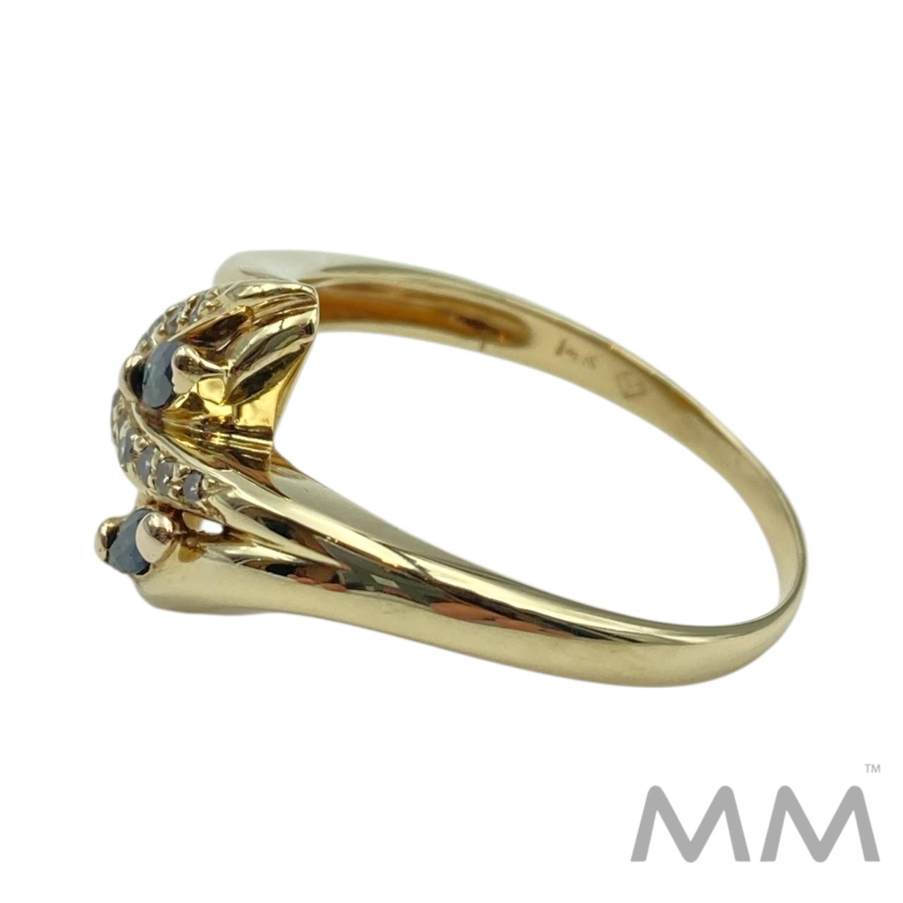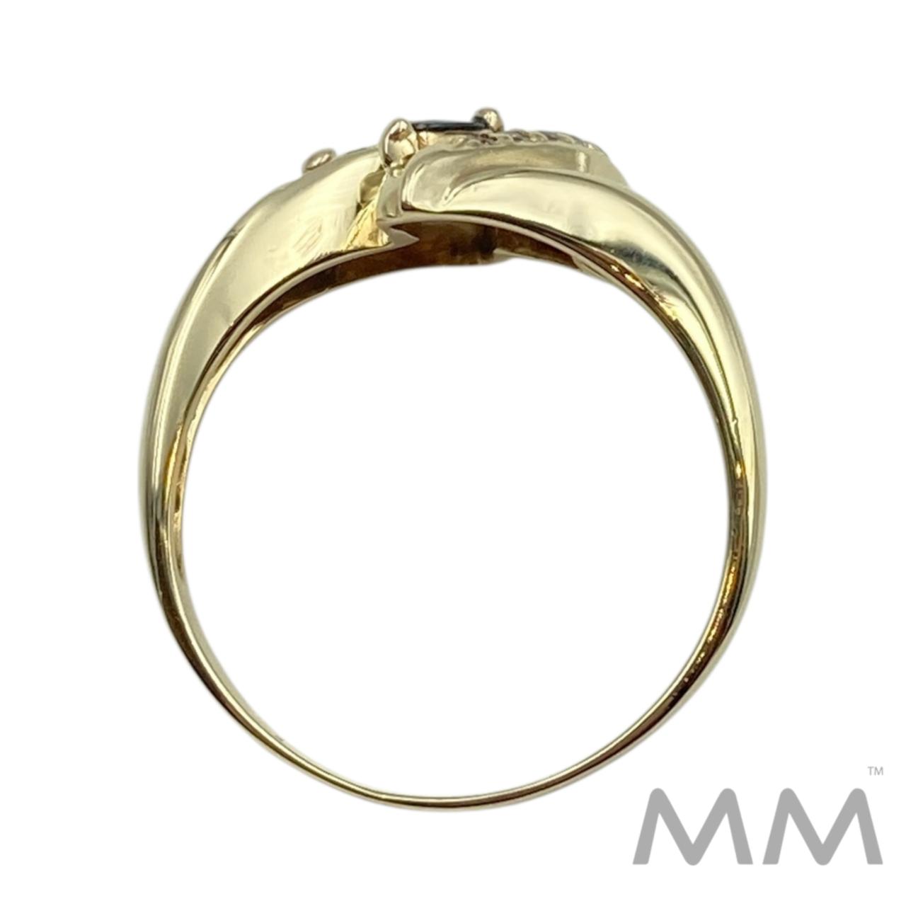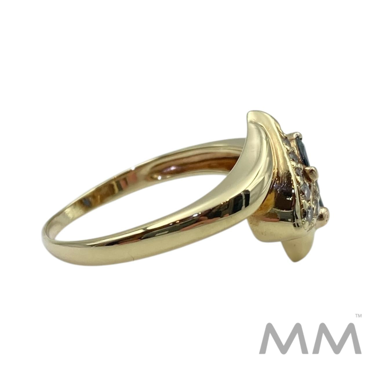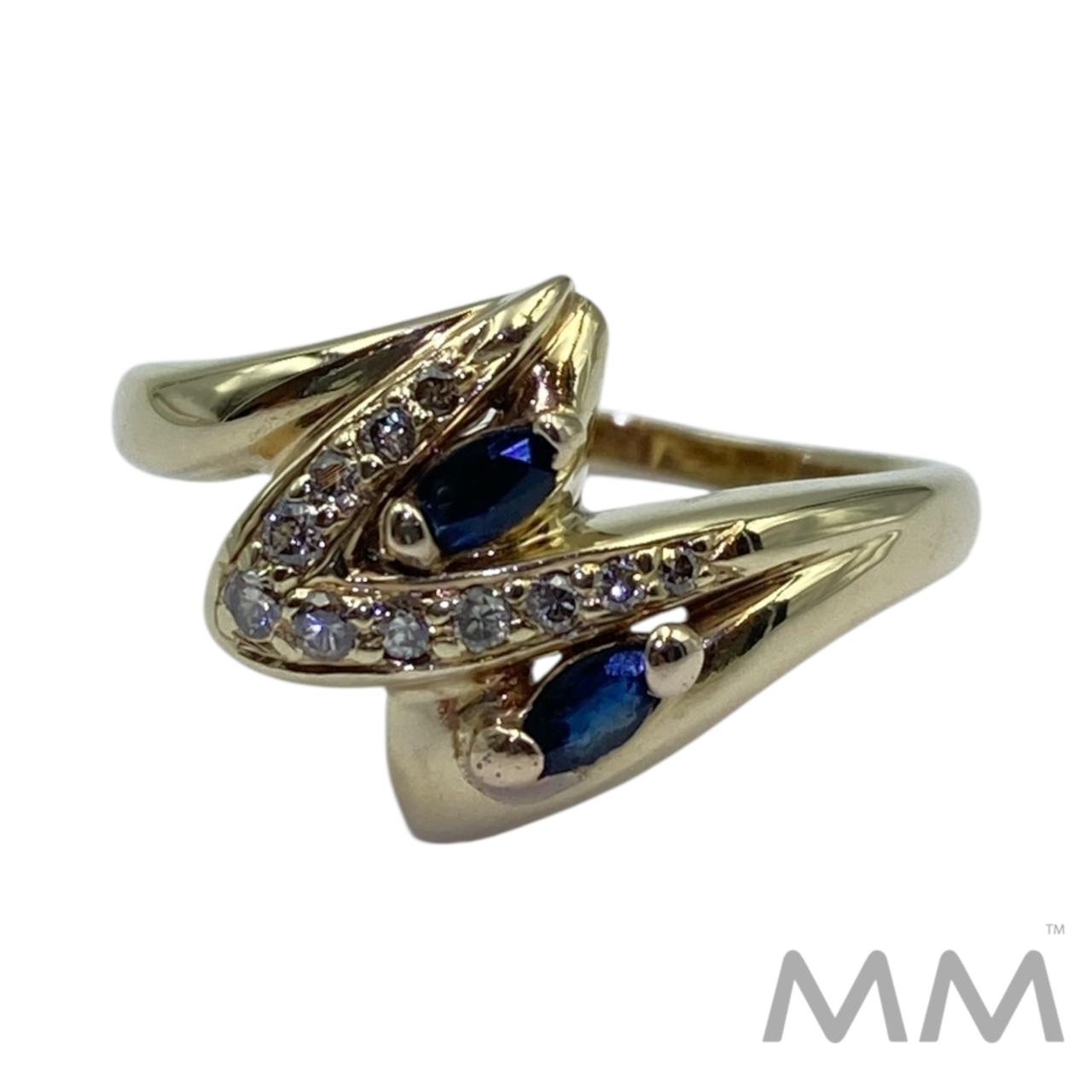 Description: This elegant 14K yellow gold ring features two marquise-cut sapphires totaling .12ctw, beautifully accented by eleven sparkling round diamonds. Weighing 3.3 grams and sized at 8.5, it offers a timeless, refined look with radiant color and brilliance.